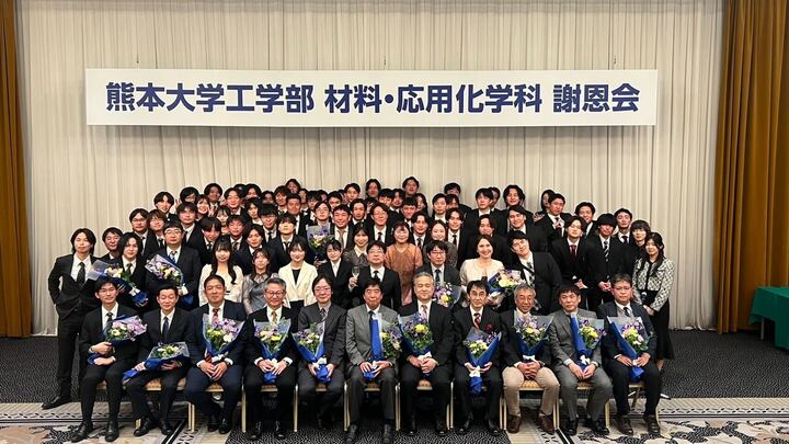 令和7年度熊本大学卒業生謝恩会が開催されました。 物質材料工学教育PGの卒業予定者の皆さんが盛大な謝恩会を開いてくれました。 学生会長の高濱君お疲れさま。素敵なスピーチありがとうございました。 今年も素敵な思い出と花束ありがとうございました。 会場 眞山学科長 学生会長 全体集合写真 研究室1 研究室2 主賓 今年の花束